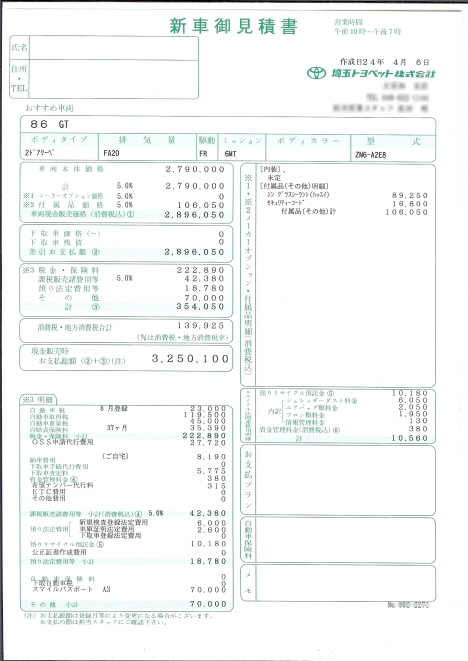 この他、見積もり書にある「スマイルパスポート:7万円」というのが何か気になりましたが、これは、最初の車検までの基本的なメンテナンス(オイル交換など)をパックにしたものだとのこと。行き付けのカーショップがあるならばこれは不要ですね。